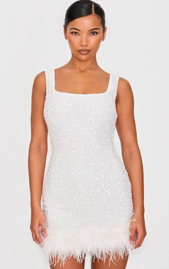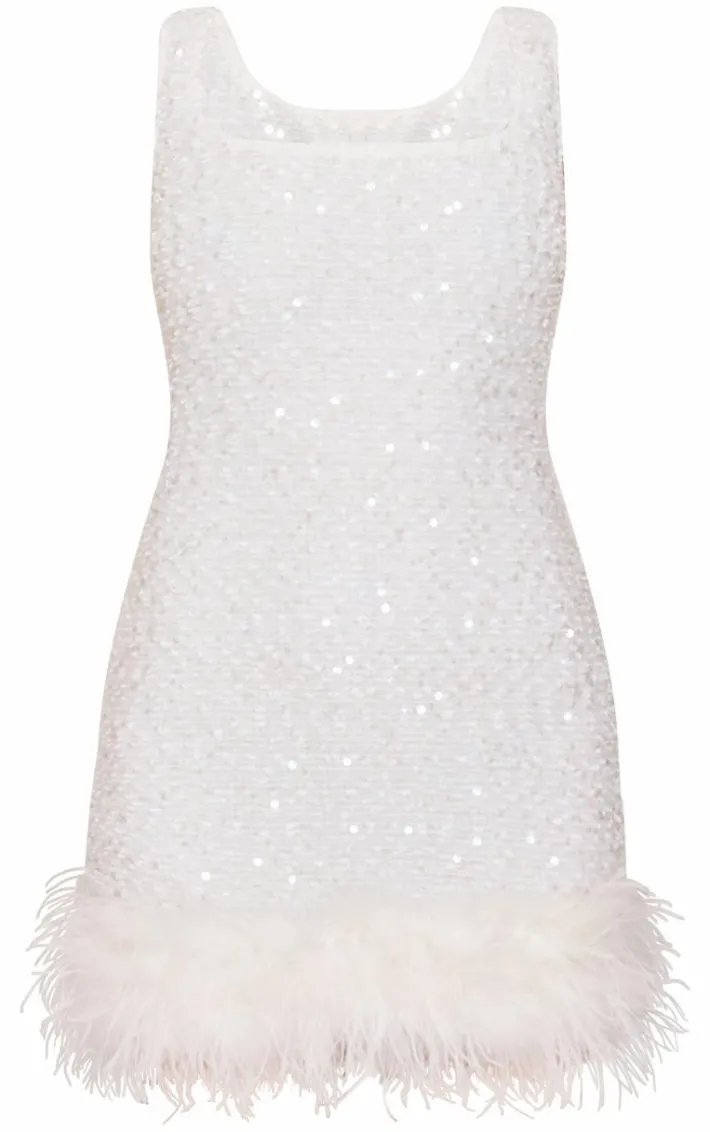 Look all kinds of chic in this white sequin scoop neck feather hem shift dress. Brought to you in a white hue sequin material with a scoop neckline and feather hem detail, this shift dress is all the new you need to look your best this season. Pair with slip on heels and simple accessories to elevate the look.