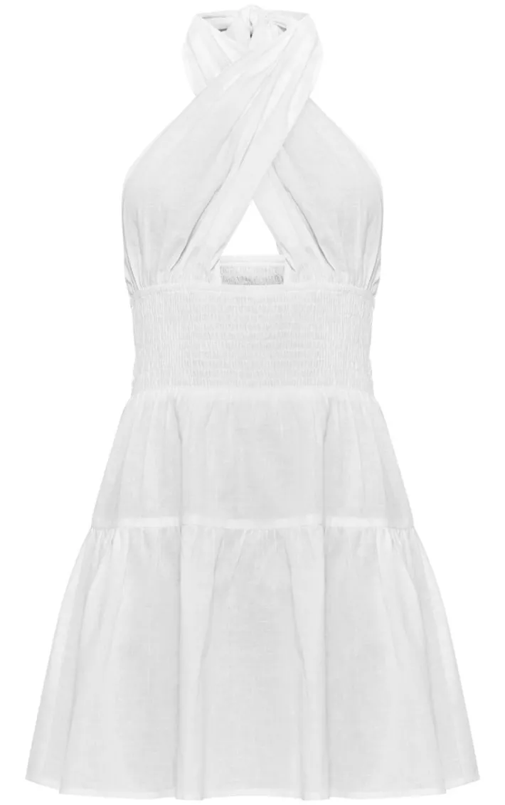 Enter the new season in style with this white shirred cross halterneck shift dress. Brought to you in a white hue material with a cross halterneck design, shirred detailing and a shift style, how can you not fall in love? Style this shift dress with sandals, oversized sunglasses and a tote bag for simple yet chic everyday look.