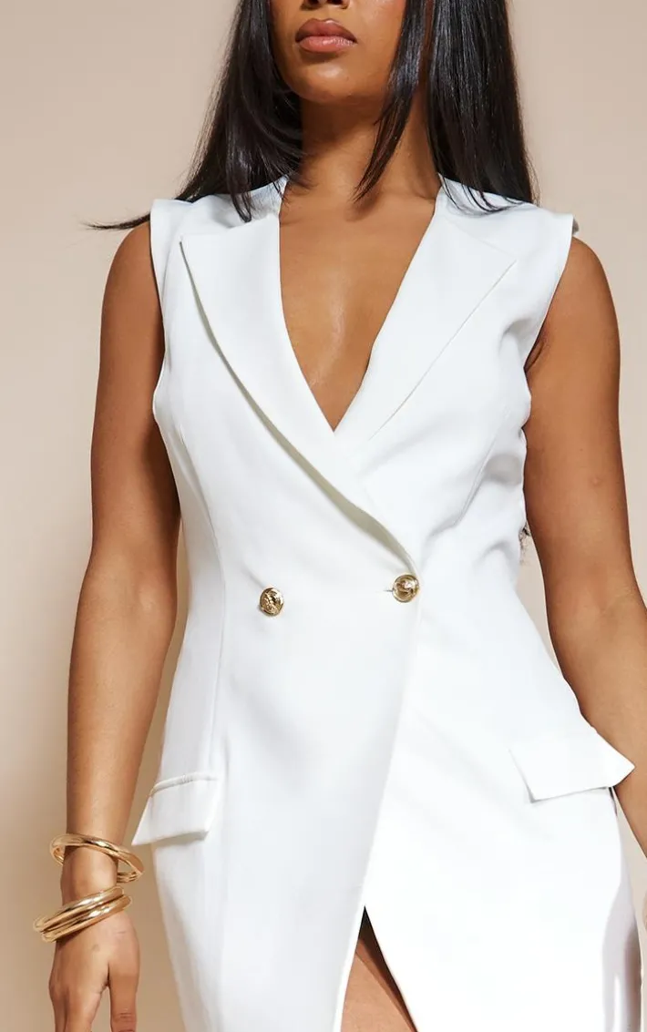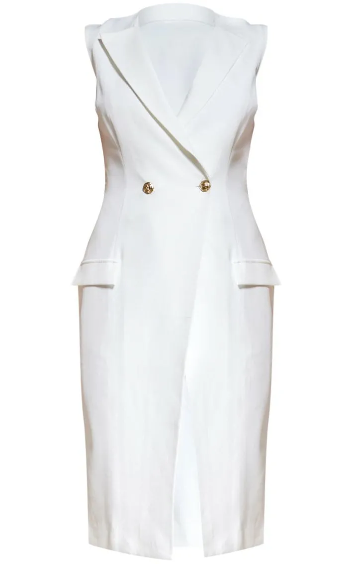 This midi dress is sure to have you looking chic this weekend , the perfect piece for those special occasions and beyond. Featuring a white material with a sleeveless design and a blazer style. This blazer dress is a must-have in your wardrobe to take you from season to season. Simple yet chic and effortless, we know this will be your newest go-to fit. Team this with clear mules and minimal accessories for a look that is sure to have all eyes on you.