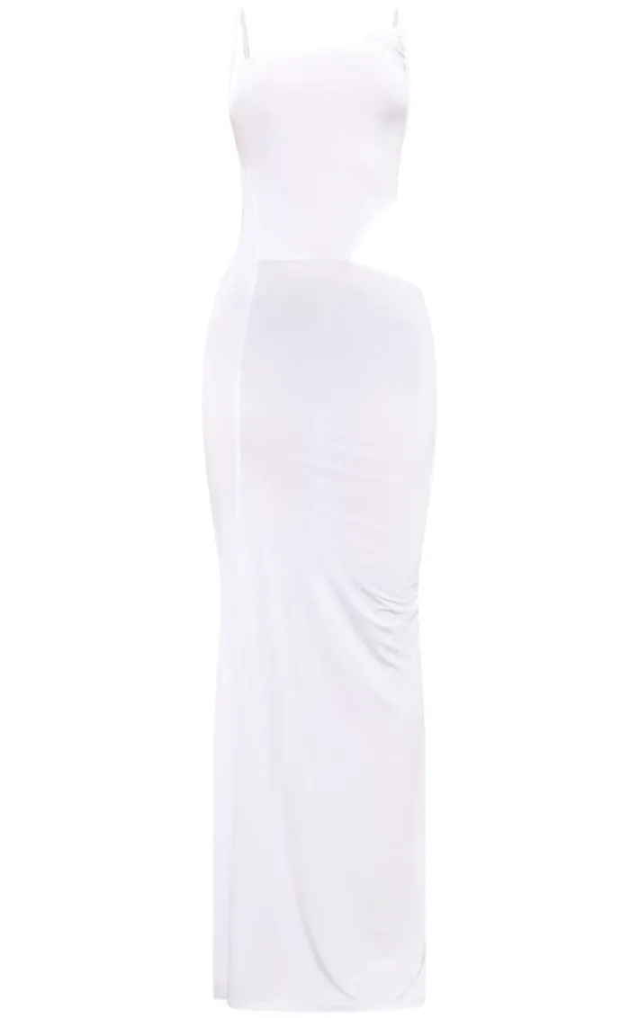 Create a look no one will forget with this show-stopping white slinky cowl side cut out detail strappy maxi dress. Brought to you in a white slinky material with a cut out design and a maxi length, this strappy dress is here to solve all your ‘what to wear’ dilemmas. Just add your highest heels and hoop earrings to show off your confident side.
