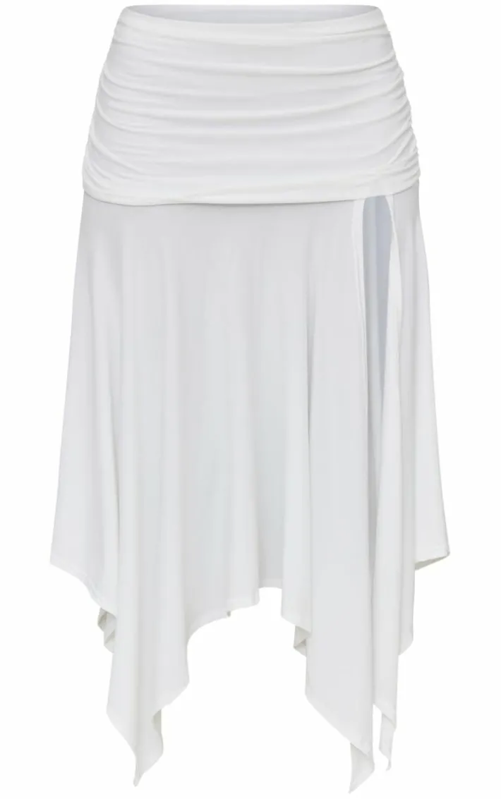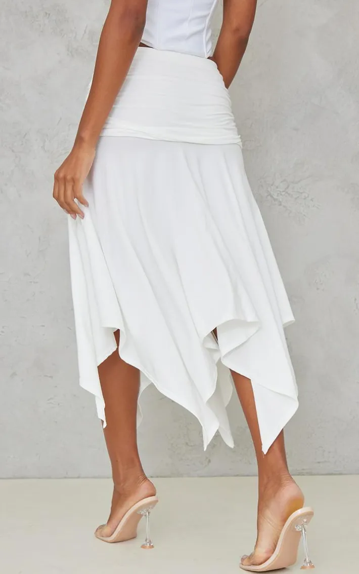 Get ready to nail new season trends in this white soft touch ruched asymmetric midi skirt. Seriously on-trend, this midi skirt is a must have for your weekend wardrobe. This skirt is made from a white soft touch material and features a ruched asymmetric hem and a midi length, we are obsessed. Style with a figure-flattering corset top, heels and statement accessories for a look that will have all eyes on you.