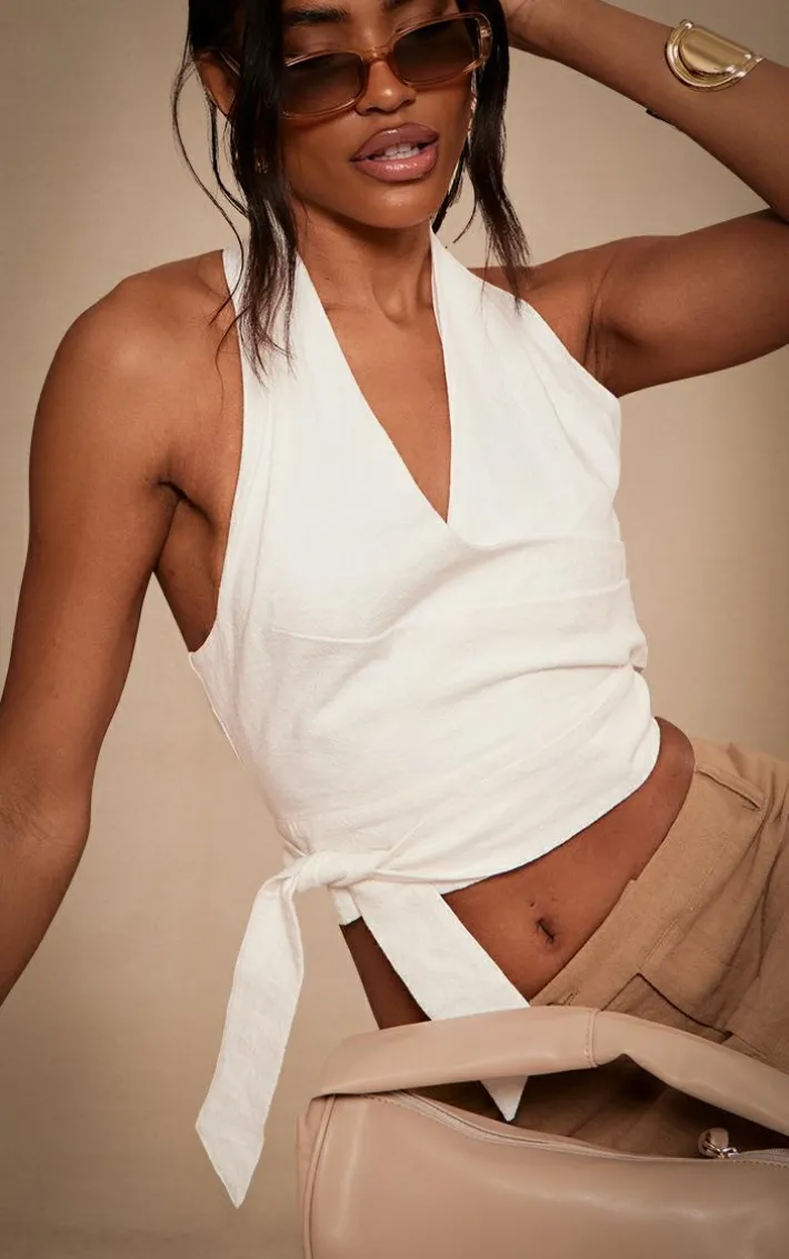 Found some last-minute weekend plans ? Then you need to add this white structuredlinen look pleated halter crop top to your basket. Made from a white linen look material with a structured design and a pleated halter fit, how could you say no? Be prepared to turn heads for all the right reasons in this crop top. Simply add some slipo on heels, a maxi skirt and gold accessories for a flawless finish.