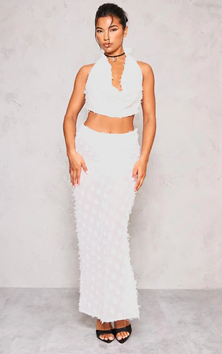 Give your weekend wardrobe the upgrade it deserves with this white textured chiffon extreme cowl neck crop top. Brought to you in a white hue textured chiffon material with an extreme cowl neckline and a cropped fit, how can you resist? Style this crop top seamlessly with the matching skirt, heels and gold accessories for a look that is sure to have eyes on you for all the right reasons.