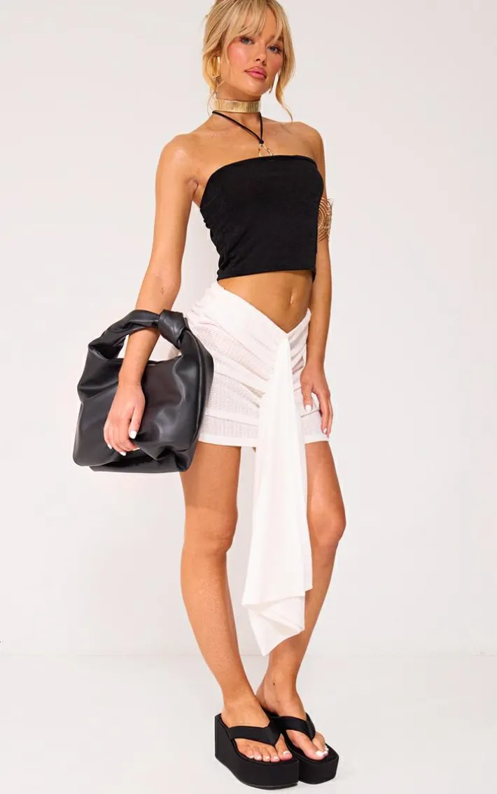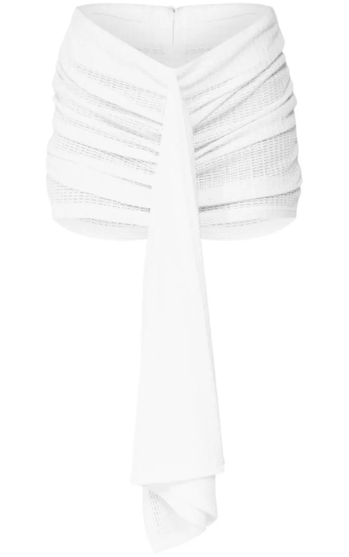 Take your weekend look to new heights with this white textured rib drape front ruched mini skirt. Brought to you in a white hue textured rib material with a drape front design and ruched detailing, how can you resist? Style this mini skirt with a bandeau top, flatform sandals and gold accessories for a look that is sure to steal all the stares.
