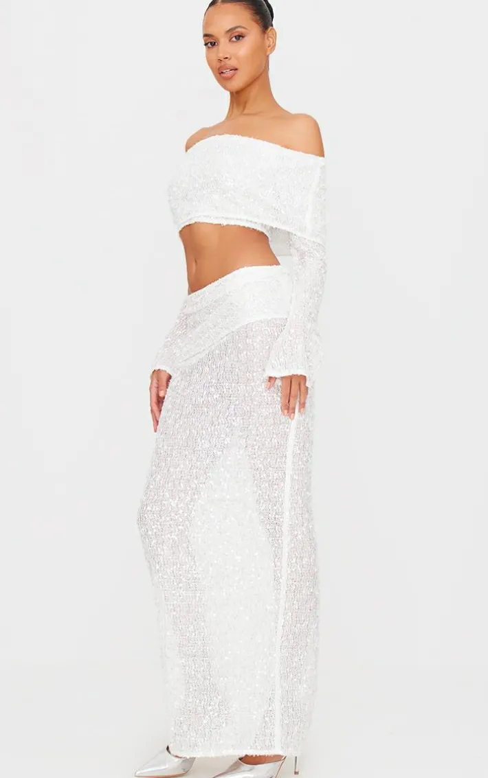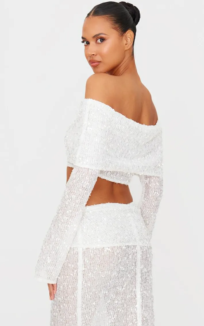 Make heads turn in this white textured sequin foldover bardot top. Brought to you in a white textured material with a foldover bardot neckline and sequin detailing for that extra touch of luxe, we are obsessed. pair this white top with the matching skirt and heels for a weekend-worthy look to be remembered.