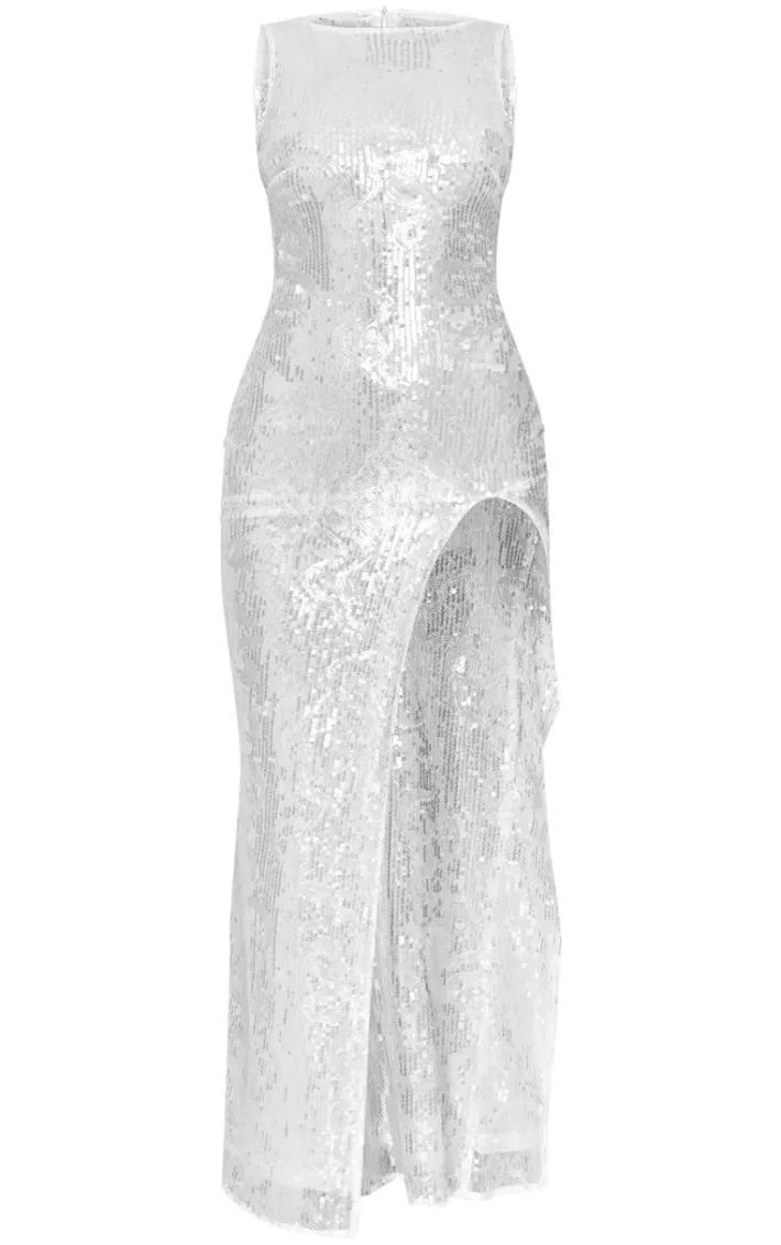 Steal all the attention in this white textured sequin racer neck maxi dress. Made from a white hue textured material with a sequin detail and racer neckline, this maxi dress is sure to elevate your new season wardrobe. Style with silver heels and accessories for a statement finish that won’t go unnoticed.