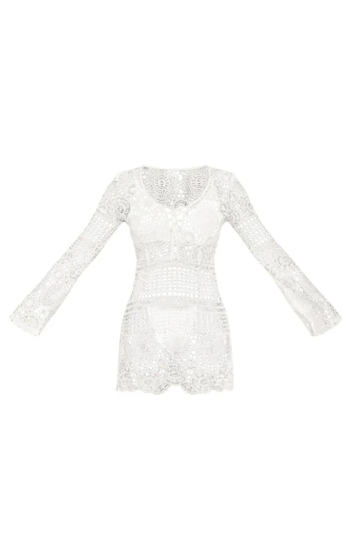 Bohemian trends are sticking around for the new season in and this 70s inspired crochet mini dress works lust-worthy styling. In a soft crochet fabric and featuring lace up front and bell sleeves, this dress works unique and ultra-cool style. Team with suede ankle boots for a perfect hippie vibe.