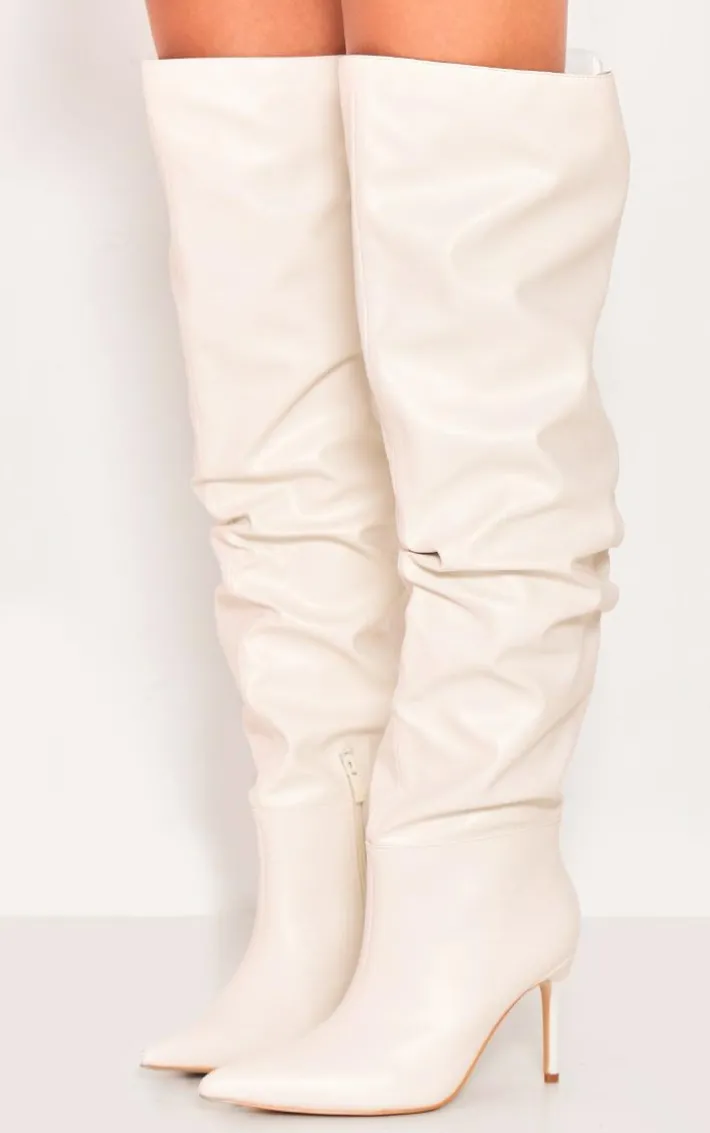 Step into the new season in style with these unreal white wide fit faux leather point toe over the knee high heeled boots. Brought to you in a white faux leather material with a point toe design and a wide fit, we are so obsessed. Perfect for dressing up or down, these over the knee high heeled boots are all you need to set major trends. Team with some hot pants and your fave shirt for a date.