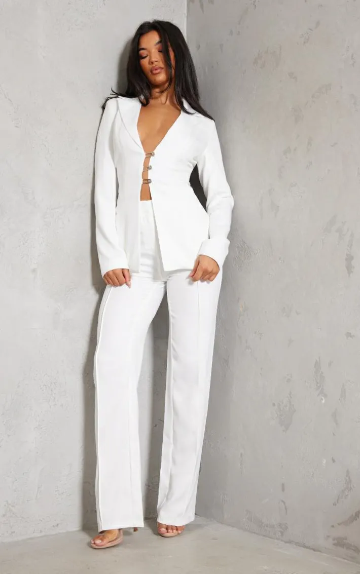 Take your weekend look to new heights with these bottoms. Featuring a white material with a wide leg and a high waist, we’re in love. Wear with the matching blazer, high heels and accessories for a look we’re loving.