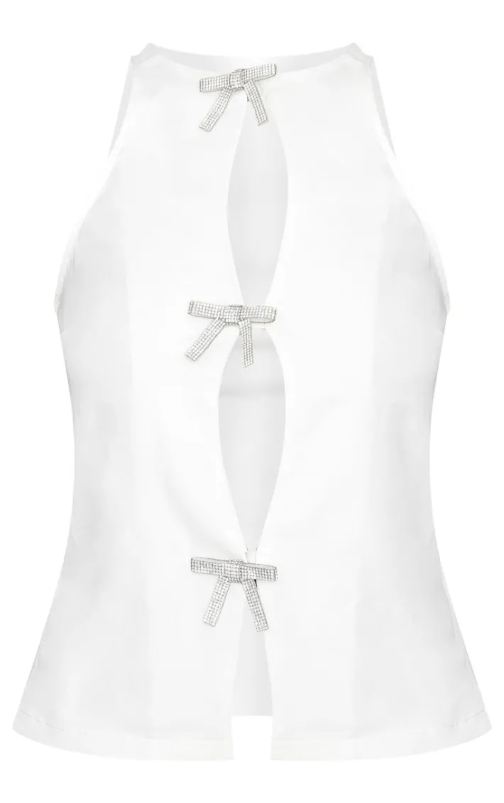 Make styling easy with this white woven diamante bow split long top. Brought to you in a white hue woven material with a diamante bow detail and split design, this long top is a must have. Pair with a black skirt, sheer tights and slip on heels for a chic look everyone will be asking about.