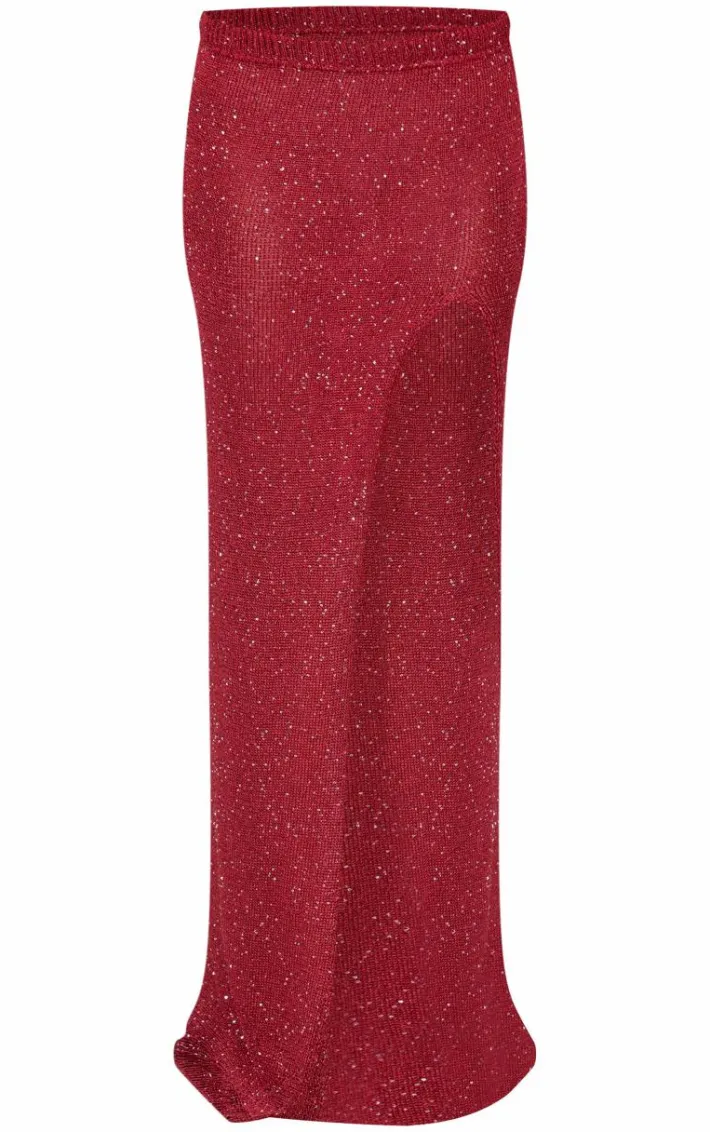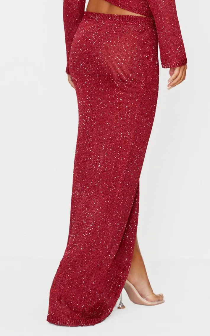 New season skirts have arrived, and this wine sequin knit side split maxi skirt is a must-have. Brought to you in a chic sequin knit fabric with an irresistible wine hue and side split feature, you’ll be entering the room with so much confidence. Shop the look to pair this maxi skirt with the matching top, clear heels and silver drop earrings.