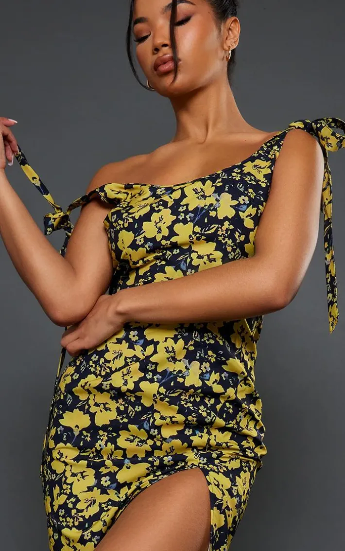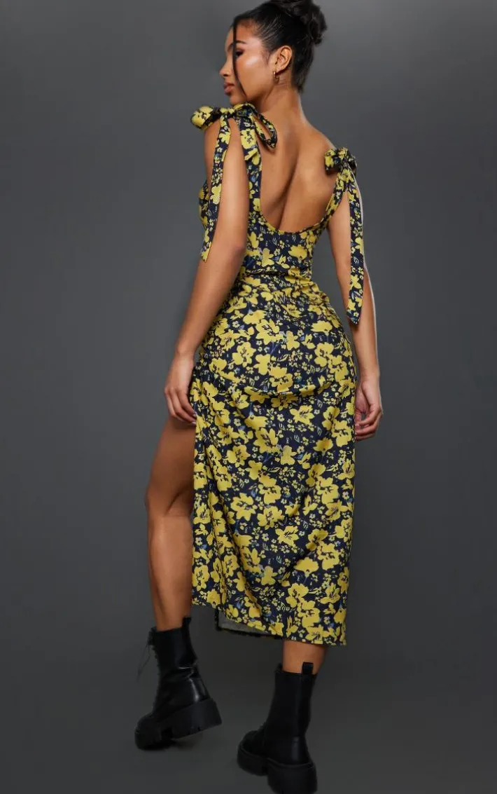 Give your everyday look an edge with this yellow floral print tie-sleeve split midaxi dress. Its yellow floral print material adds a feminine touch to your off-duty vibe whilst its split hem shows off your unreal figure. This midaxi dress has a tie-sleeve and a flattering fit making it the ultimate choice for the new season. Grunge down the vibe with chunky boots, your fave accessories and a fierce attitude.