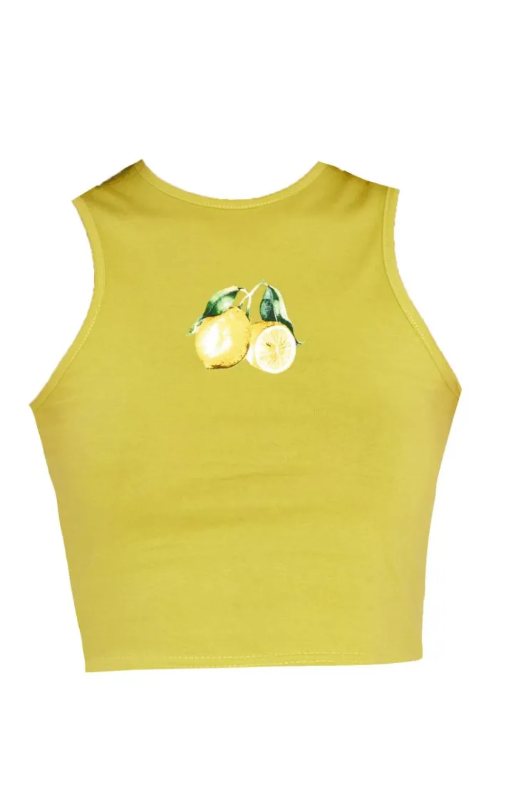 Amp up your style game with this yellow lemon graphic detail racer vest top. Brought to you in a yellow hue material with a lemon graphic detail and racer vest design, this top is ‘add to bag’ worthy. Style with white bottoms, white flats and a tan mini bag for a chic look we can’t get enough of. It’s a yes from us.