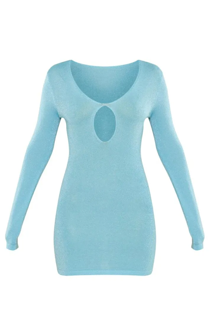 Stand out from the crowd in this aqua glitter knit plunge cut out dress. Brought to you in a dreamy aqua hue knit material with luxe glitter detailing, a plunging neckline, long sleeves and a cut out design that’s brining all the drama, how can you resist this dress ? Style with clear strap heels, statement accessories and a glam mini bag for a look that is perfect for your next occasion.