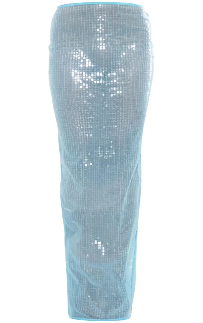 Make the ultimate fierce statement this season with this aqua sheer sequin split back maxi skirt. With an aqua sheer material, sequin detailing and a split back design, this skirt is here to help show off your confident side. Pair with a bold top, heels and simple accessories for a look no one will forget.