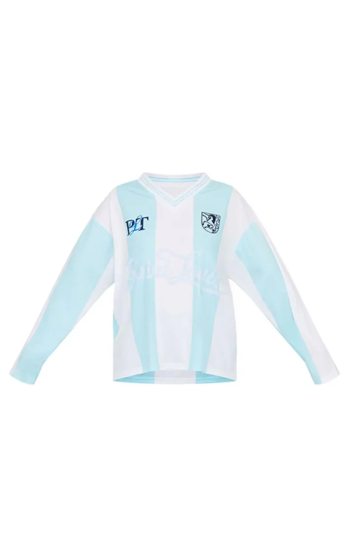 You’re going to look effortlessly cool in this baby blue logo sports striped long sleeve jersey. Add a pop of color to your wardrobe with this unreal blue shade, paired with a sporty logo detail and striped design, we can’t get enough. Style this with some black capri pants and ballet flats to stay at the top of your style game.