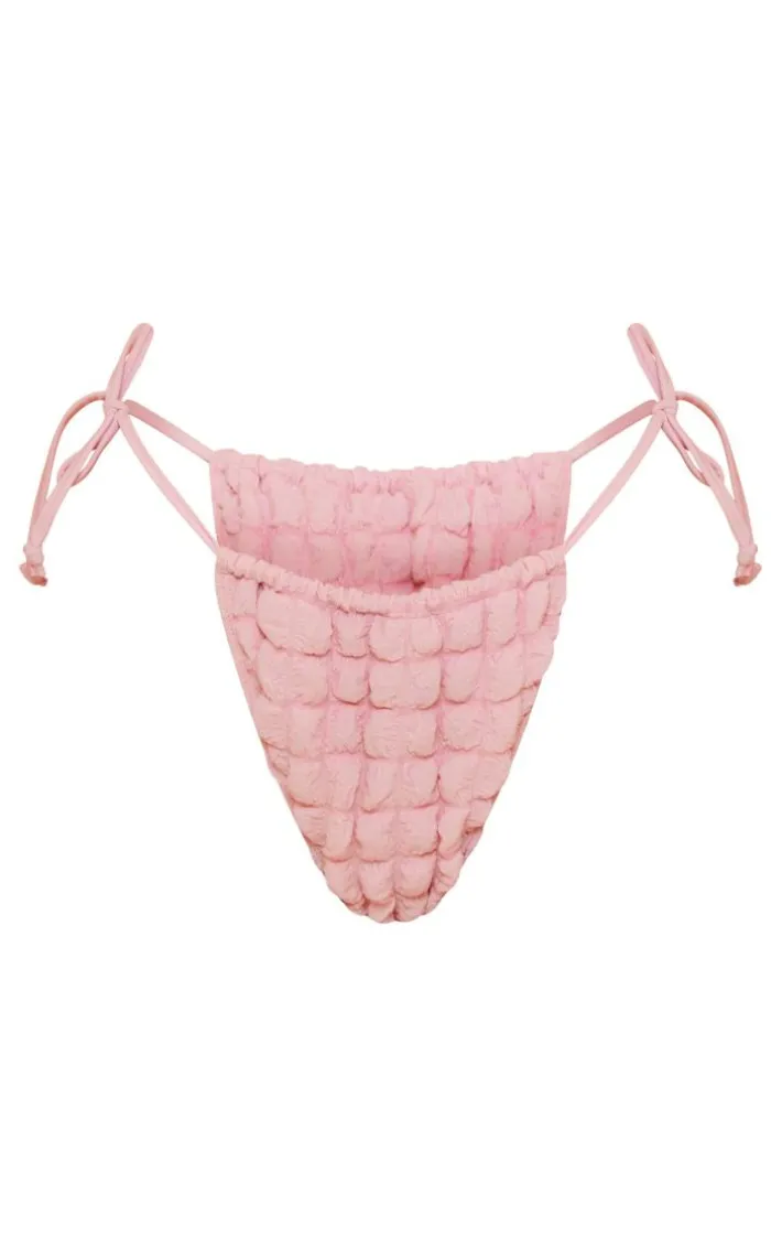 Take your poolside look to the next level with these baby pink bubble string side bikini bottoms. These bikini bottoms are perfect for your vacay styling and beyond. Brought to you in a baby pink bubble material with a string side design, we simply cant get enough. Style with the matching bikini top and a pair of gold hoops for a look that we cant get enough of.