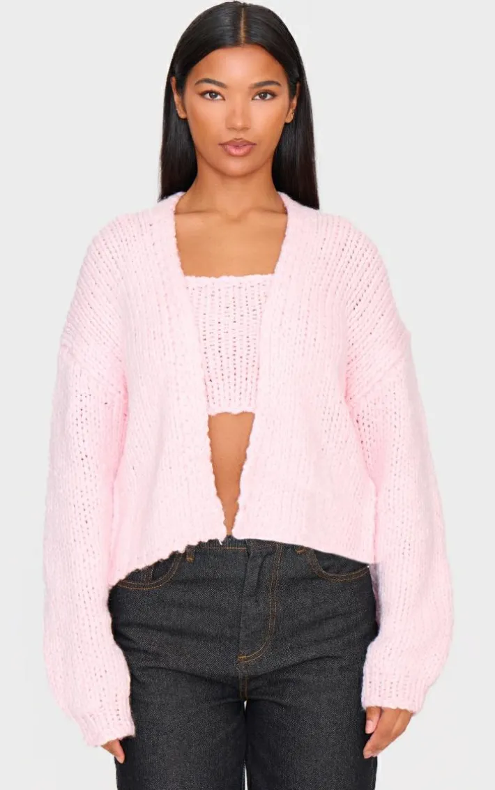 Elevate your new season wardrobe with this baby pink chunky knit cami top and cardigan set. Made from a baby pink hue knit material with a chunky design, it’s a yes from us. This set contains both a cami top and cardigan, what’s not to love? Style with blue jeans, fresh kicks and simple accessories for a chic finish we’re loving.