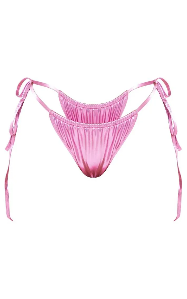 Make heads turn in this baby pink metallic adjustable string tie bikini bottoms. These bikini bottoms are brought to you in a baby pink metallic material with an adjustable string tie giving you a flattering fit we are obsessing over. Team with the matching bikini top and your fave poolside essentials for a look that will have you topic of everyone’s conversations.