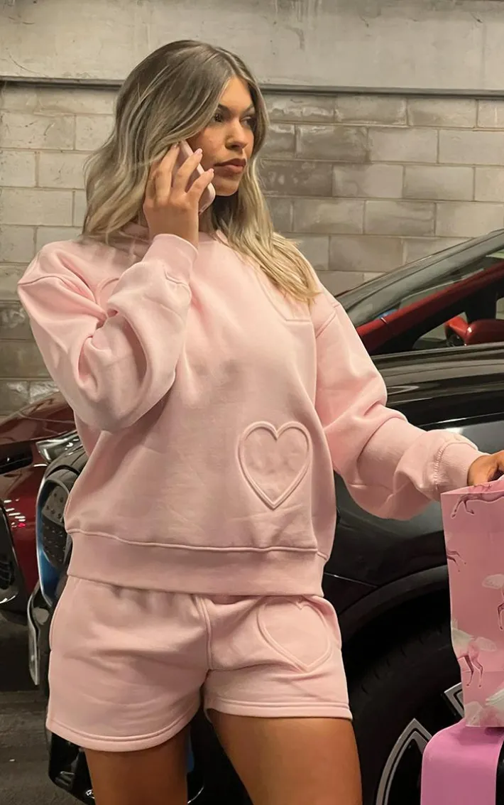 These baby pink oversized heart embossed runner shorts are sure to have all eyes on you. These shorts are brought to you in a baby pink material with an oversized heart embossed design, what’s not to love? These shorts won’t let you down. Style these with the matching sweatshirt, box-fresh kicks and accessories for a look like no other.