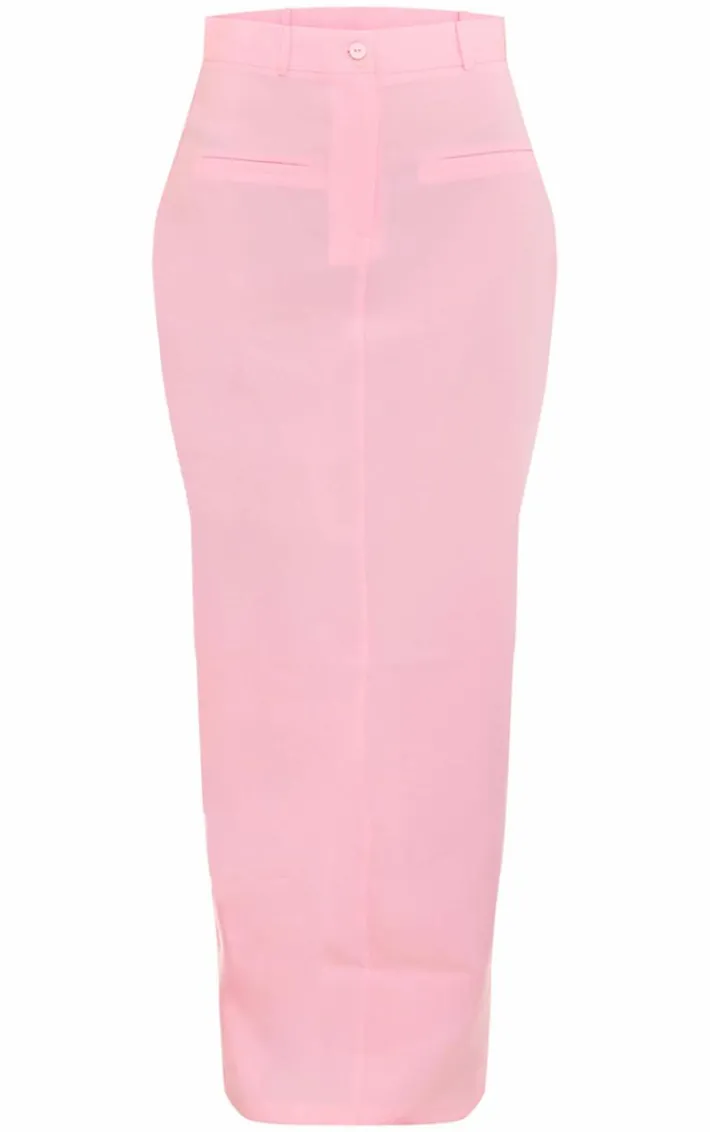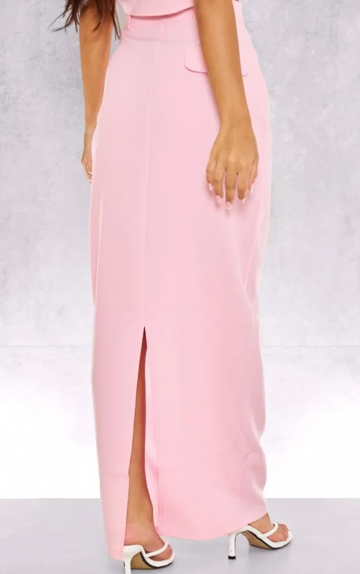 You are guaranteed to steal all the stares in this baby pink tailored seam detail back pocket maxi skirt. Brought to you in a baby pink material with a tailored fit seam detailing and a back pocket design, how can you resist? Seriously chic and in a figure-flattering fit, this maxi skirt is perfect for your next occasion. Just add the matching waist coat, your heels and some glam accessories to take the look to a whole new level.
