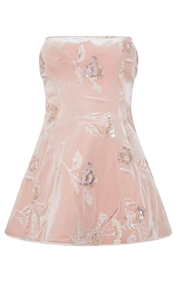 Own the night in this baby pink velvet embellished bandeau a line dress. Brought to you in a baby pink velvet material with a bandeau fit and an a line design, you are sure to make a statement. Team with a pair of heels and your go-to accessories for a look that will get you noticed.