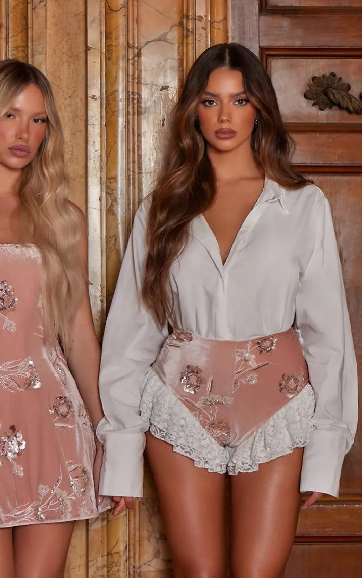 Bring all the velvet feels to your weekend look with these baby pink velvet embellished frill detail bloomer shorts. Made from a baby pink hue velvet material with a frilled design and embellished detailing, how can you resist? Style these bloomer shorts with a white shirt and heels for a look that is sure to have all eyes on you.