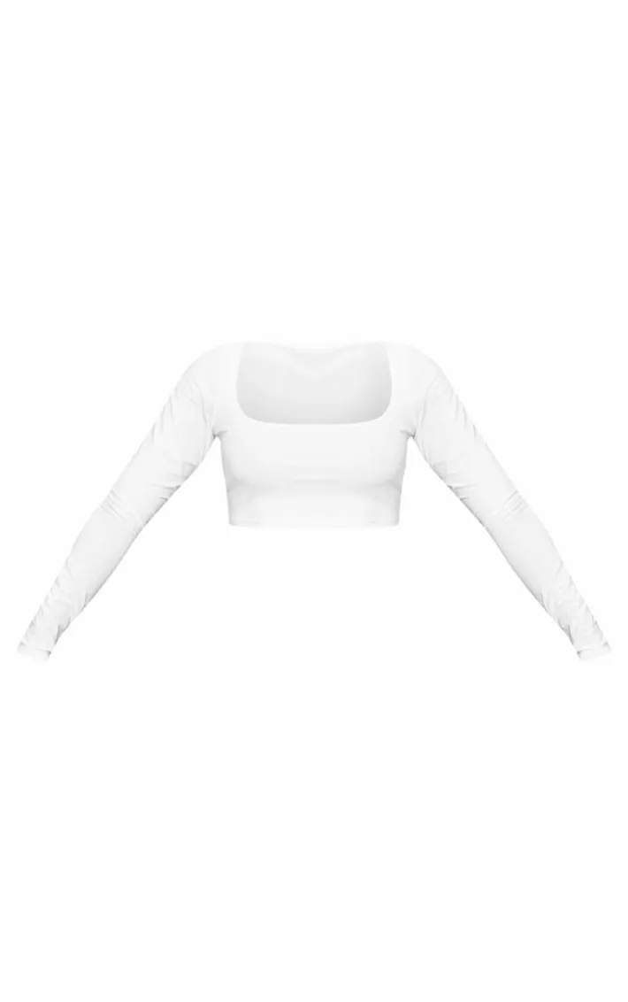 Level up your new season basics with this top. Featuring a white slinky material with a square neck design and a cropped length. Team with blue heans, heels and a mini bag for a simple but chic look.