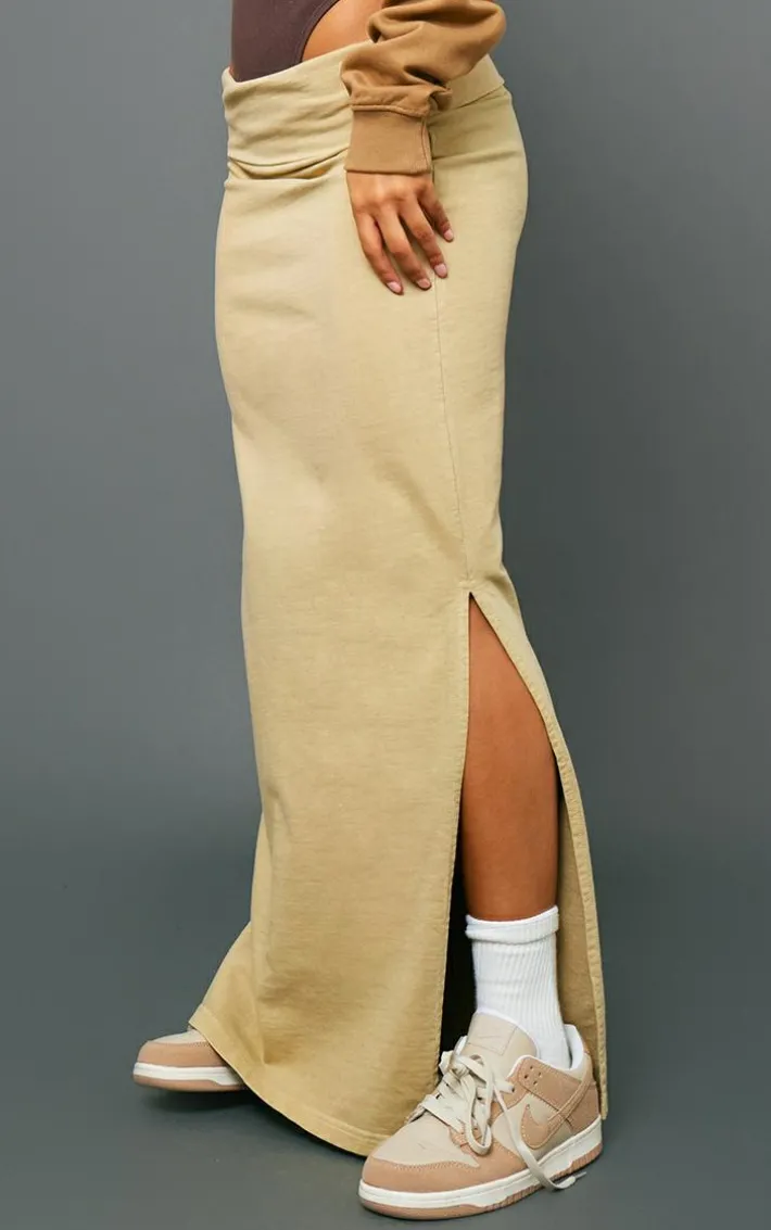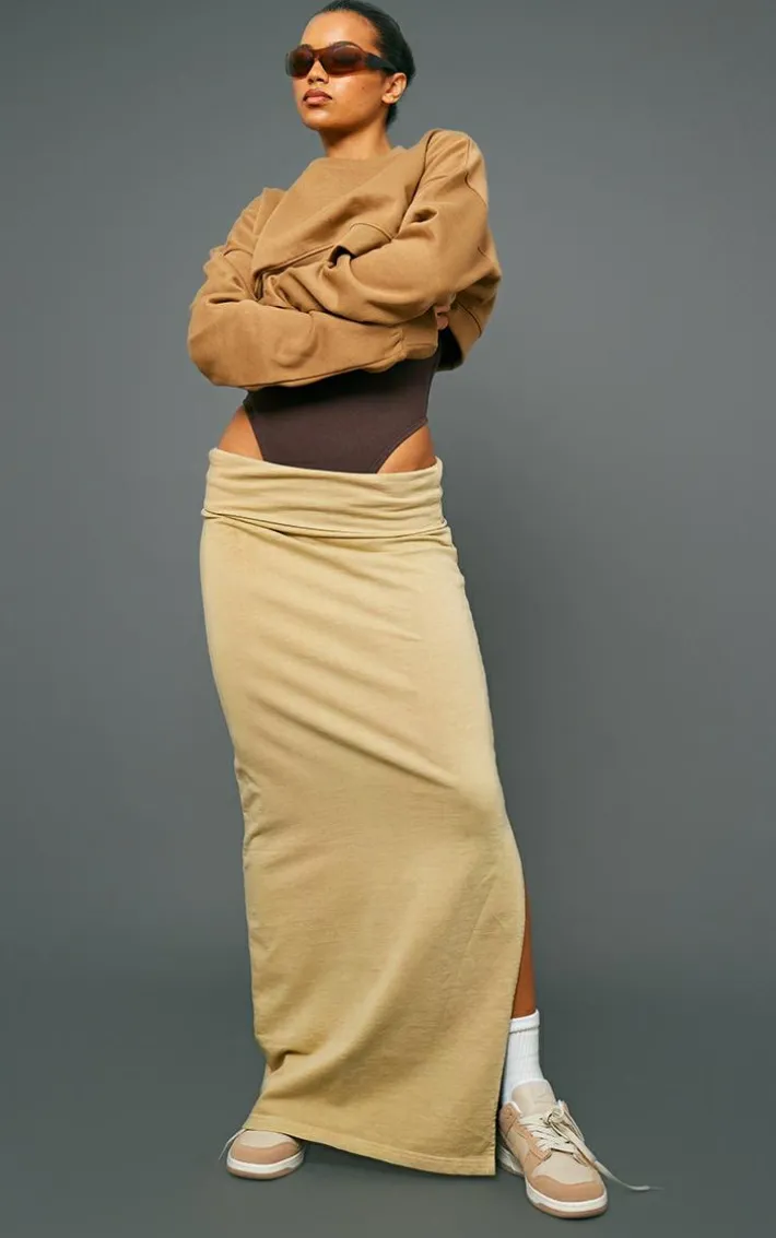 Make a statement this season with this beige acid-wash cotton fold-over maxi skirt. Brought to you in a beige cotton material with an acid wash design bringing all the edge to your look. Its fold-over detail and maxi length, what more could you want? Team with a cropped sweater and some of your fave accessories for an Insta-worthy look we are loving.