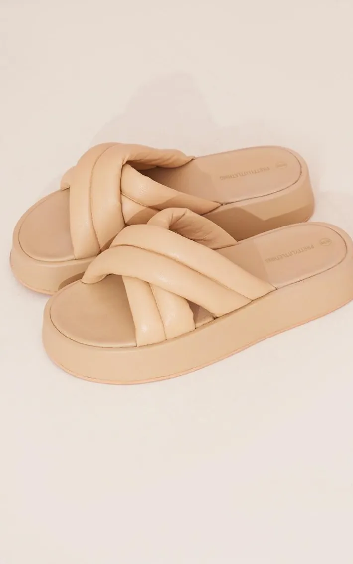 These sandals are perfect for the new season. Featuring a beige hue material with a chunky padded cross strap design, we’re in love. Just add to your outfit of the day to complete the look.