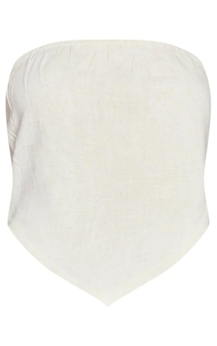 We are all about the linen feels this season and this beige linen look dip hem crop top is sure to become your new style staple. Made from a beige hue linen look material with a dip hem design, a bandeau neckline and a cropped fit, what more could you ask for? Style this crop top with some on-trend cargo pants, flatform sandals and an oversized clutch for an effortlessly chic weekend look.
