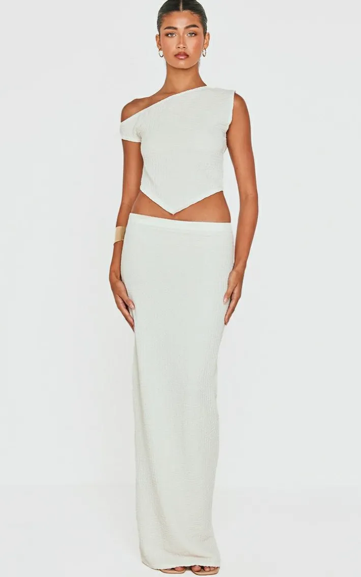 This beige textured maxi skirt is a must-have for your cosy season wardrobe. Wrap up warm for a brunch date with its beige hue, textured fabric and maxi skirt length. Pair with the matching top, nude heels and your must-have jewelry for those throw on and go moments. What’s not to love?