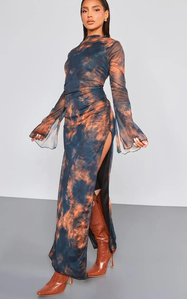 Take your look to new heights with this black abstract print mesh flared sleeve midaxi dress. This dress is brought to you in a black abstract mesh print material with flared sleeves and a midaxi length, what’s not to love? This mdiaxi dress is here to have heads turn for all the right reasons. Style effortlessly with high heels and accessories for a look that wont let you down.