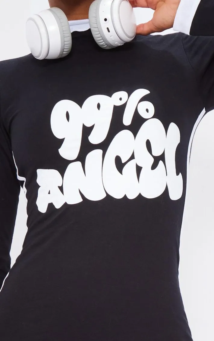 Bring all the edge to your wardrobe with this black angel graphic contrast sleeve bodycon dress. Brought to you in a black material with an ‘Angel’ graphic across the front, what’s not to love? With a contrast sleeve and a bodycon fit, you will be showing off your shape in all the right places. Team with some fresh sneakers and a shoulder bag.