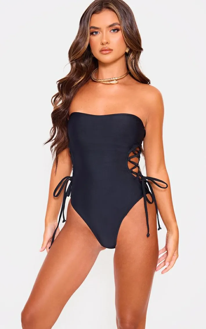 Make holiday styling look effortlessly chic with this black bandeau tie side swimsuit. Brought to you in a black hue material with a bandeau neckline and tie side detailing, how can you resist? Style this black swimsuit with gold accessories to take your poolside look that extra mile.
