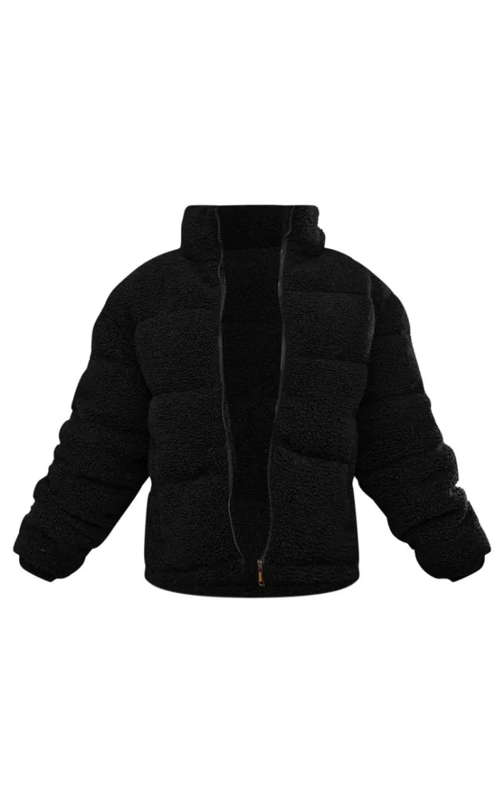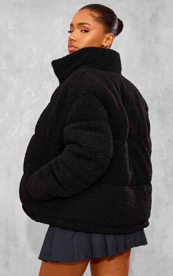 Layer up for the new season in style with this black borg teddy puffer jacket. Brought to you in a black borg material with a button through fastening and a comfy fit, how can you resist? Style this black puffer jacket with a mini skirt and loafers for a cosy finishing touch to any look.
