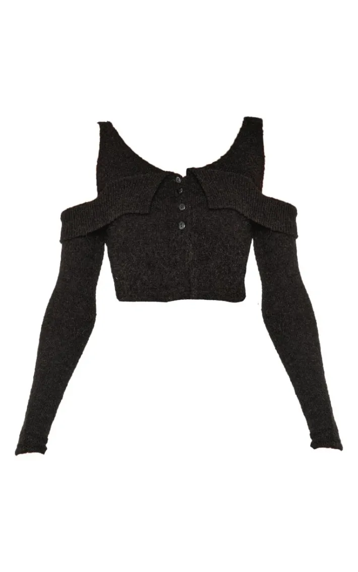 Make styling easy this season with this black boucle knit cold shoulder button up top. Brought to you in a black hue boucle knit material with a cold shoulder design and button up detail, this top is all the new you need. Style with jeans, flat mules and simple accessories for a look like no other.
