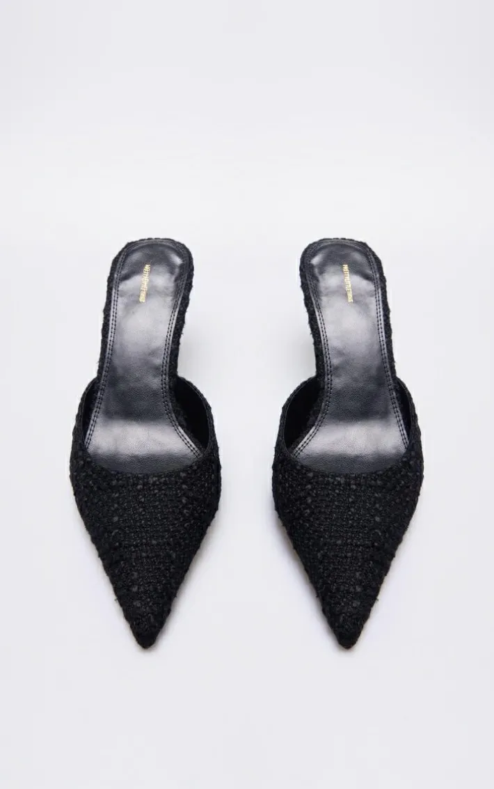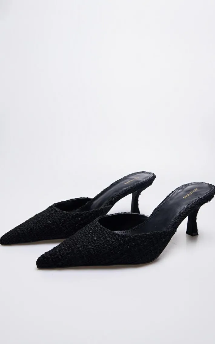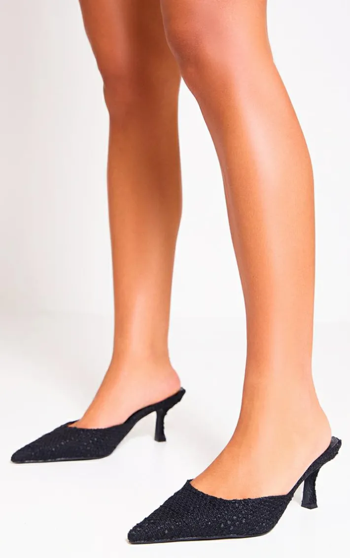 Step out in style with these black boucle point toe mid heeled mule courts. Brought to you in a black boucle material with a point toe design, what more could you want? With a mid heel, these mule courts are perfect for elevating your look even further. Pair with your go-to look to feel chic.