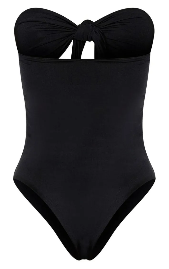 Every vacay wardrobe needs a must-have black swimsuit. Featuring a black hue material with a cut-out bow front and a bandeau neckline, style it with a maxi beach skirt and wedges to complete the look.