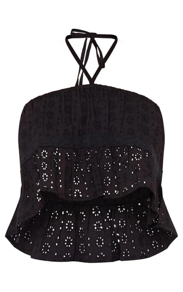Upgrade your seasonal wardrobe with this black broderie crochet trim halter crop top. Brought to you in a black broderie material with a crochet trim design and halter neck fastening, we’re in love. Style this crop top with the matching shorts, sandals and accessories for a combo we’re crushing on this season.