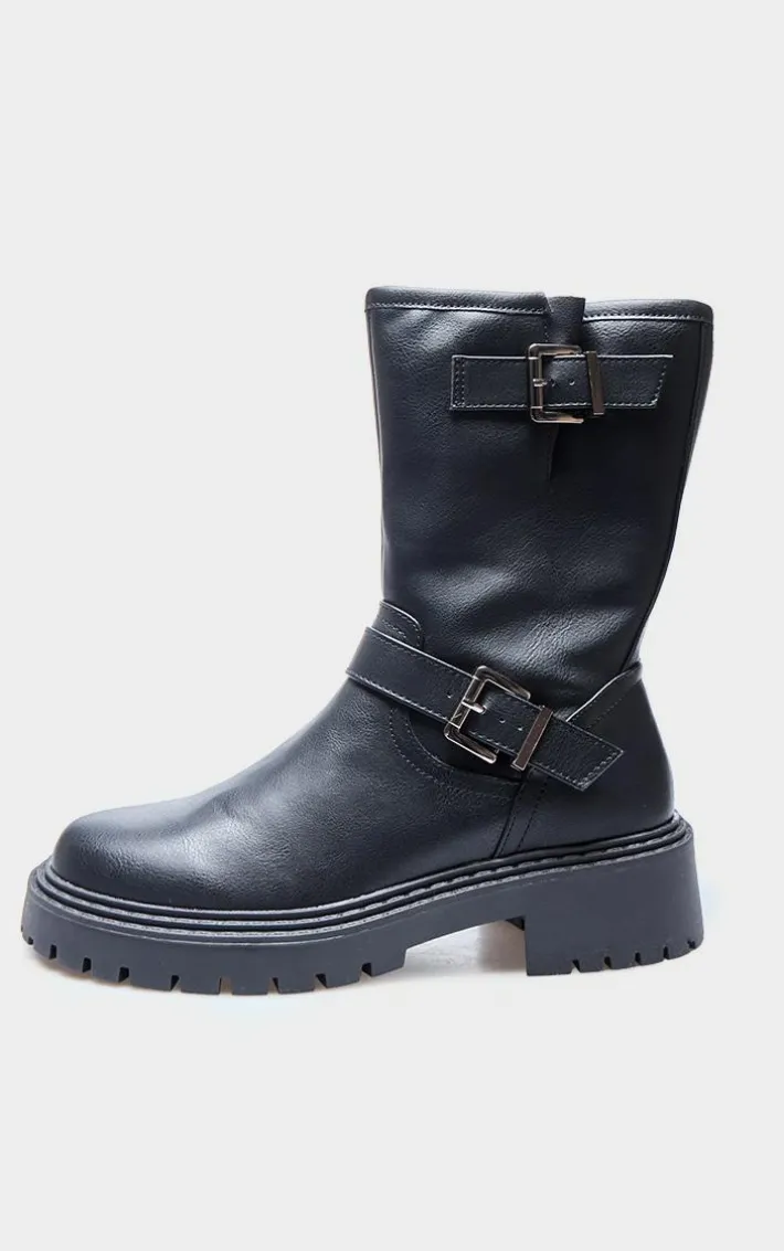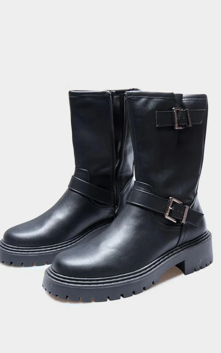 Take your outfit of the day to new heights with these black buckle detail mid calf chunky ankle boots.Brought to you in a black material with a buckle detail and a mid calf design, what’s not to love? These chunky ankle boots are sure to become your new go-to in your shoe collection. Team with any look to make heads turn wherever you step foot