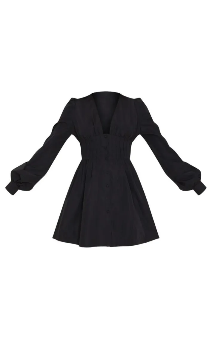 Hit refresh on your weekend wardrobe with this skater dress. Featuring a black woven fabric with a button front and puff sleeves, style with sock boots for an all-black look we’re loving.
