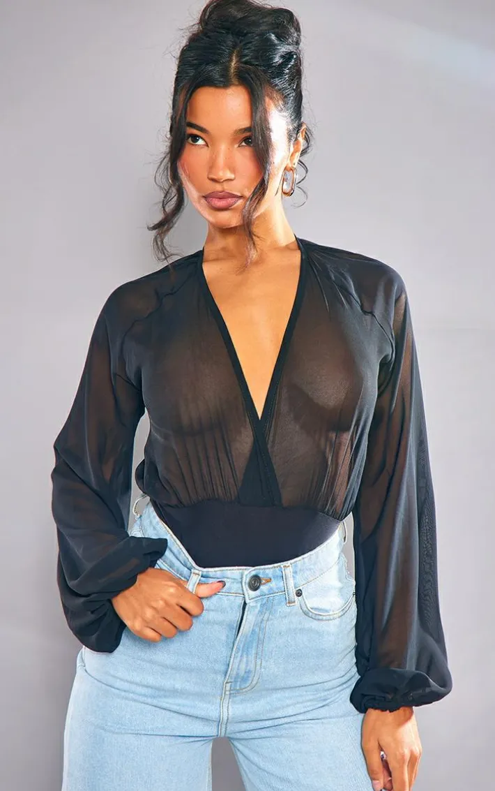 Your weekend styling dilemmas are finally sorted with this black chiffon balloon sleeve plunge bodysuit, everyone will be asking about this statement piece. It features a black chiffon material with balloon sleeves and a plunge neck design, get ready to channel all the glam vibes. Team this chiffon bodysuit with a mini skirt, slip-on heels and a shoulder bag to elevate the look further.