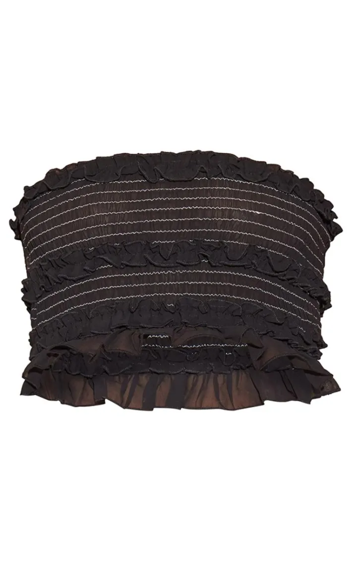 Swap your usual crop for this unreal black chiffon contrast stitch shirred bandeau crop top. Starring a black chiffon material with a contrast stitch and a bandeau neckline, this is definitely at the top of our wish list. Style this bandeau crop top with wide leg pants and sandals to level up your casual fit.