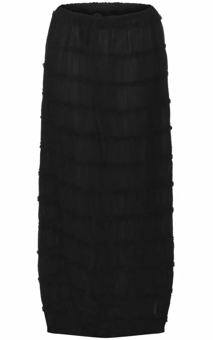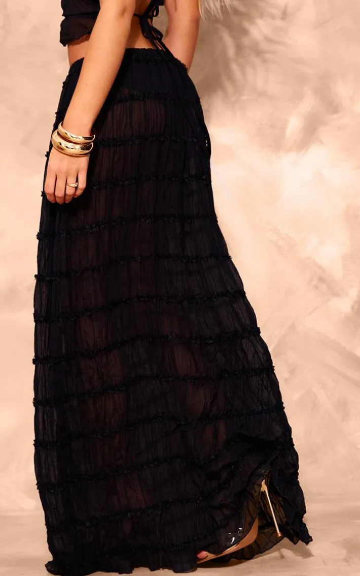 Amp up your style game this season with this black chiffon ruched netting detail maxi skirt. Brought to you in a black chiffon material with a ruched netting detail, this maxi skirt is turning heads for all the right reasons. Style with the matching top, gold heels and your fave accessories for a look like no other.