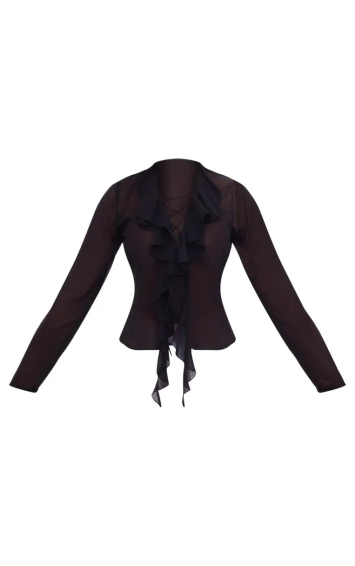 Say hello to this black chiffon ruffle lace up front shirt. Brought to you in a black chiffon material with a ruffle detail and lace up front design, this shirt is unreal. This shirt is calling your name. Pair with white bottoms and flatform sandals to have all eyes on you.