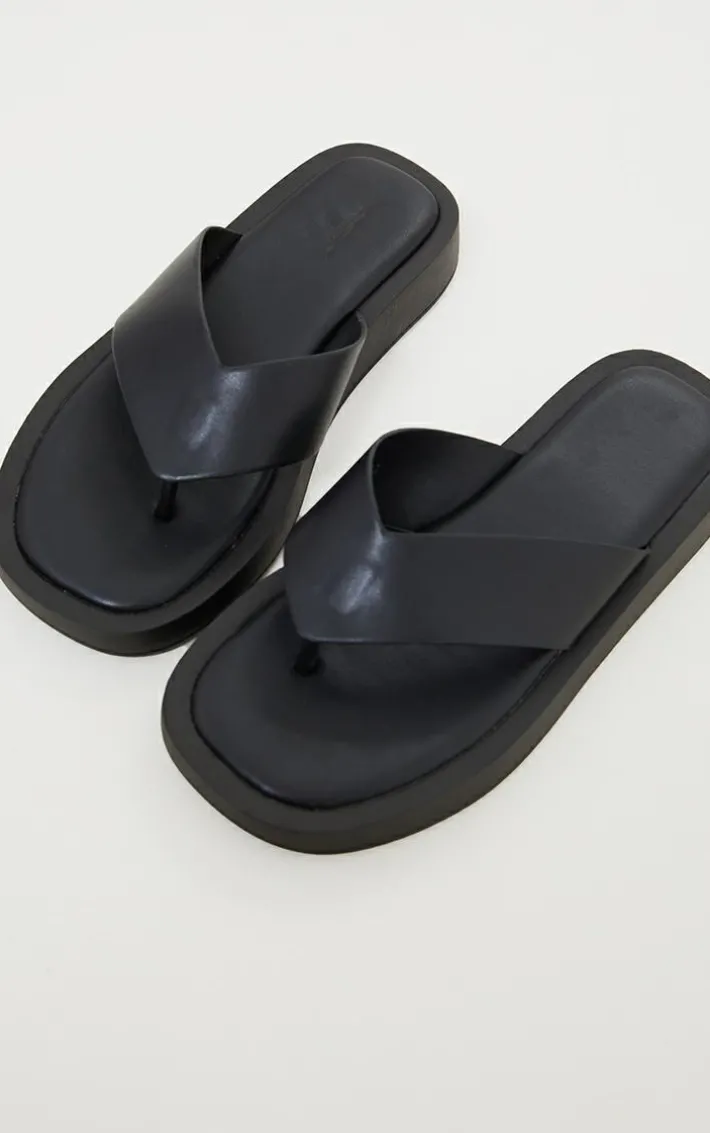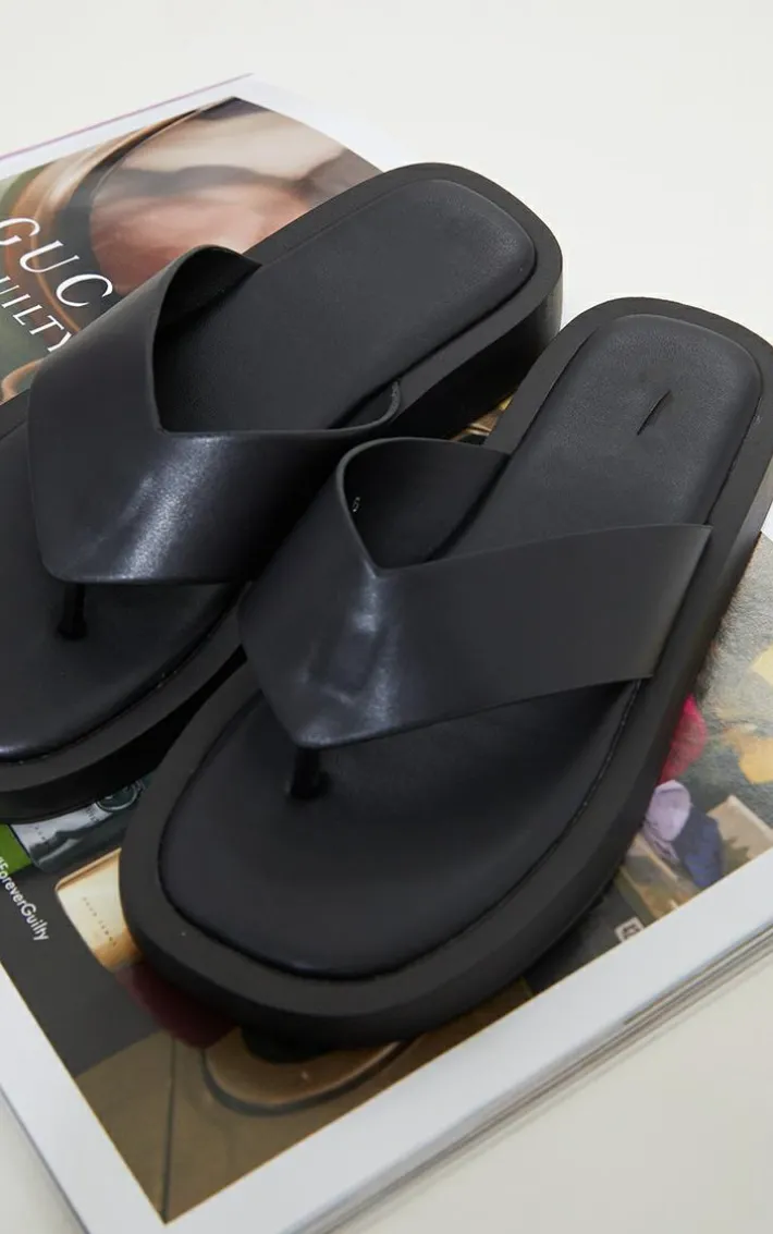 Add some summery vibes to your shoe-drobe with these flip flops. Featuring a black material with a chunky sole and toe strap detailing, we are obsessed. Team these with your everyday wardrobe for a fool-proof casual look.