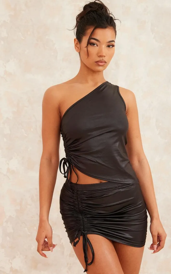 Take on your weekend the right way with this statement black coated wet look ruched micro mini skirt. Made from a black coated wet look material with ruched detailing and a micro mini length, this is everything we’re loving and more. With It’s figure-hugging fit this mini skirt is sure to hug you in all the right places. To complete the look style this seamlessly with the matching stop, knee-high boots and gold accessories for a look that will secure you all the likes.