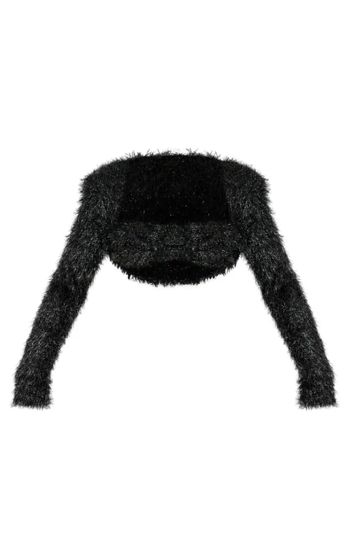 Elevate your weekend wardrobe with this black confetti look long sleeve crop top. Brought to you in a black hue material with a confetti look design and long sleeves, what more could you want? Style this black topwith the matching skirt and court heels for a chic look like no other.