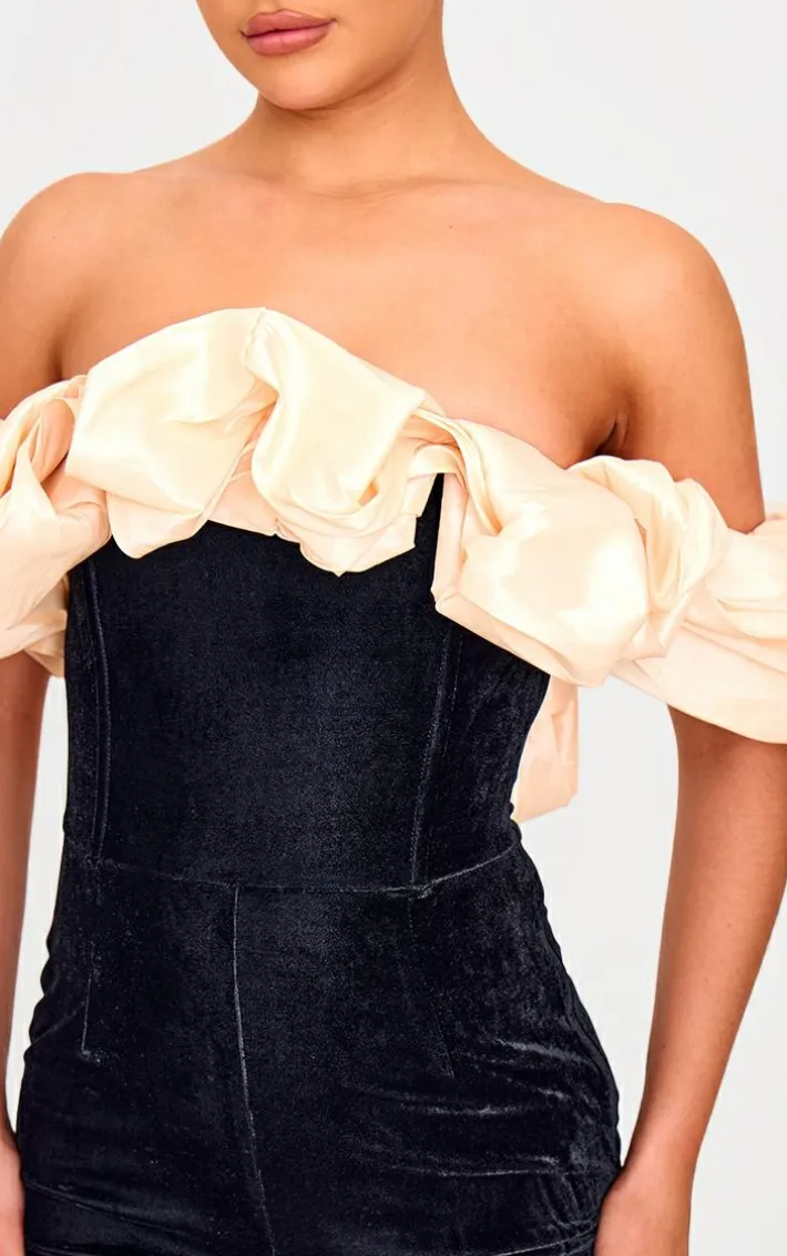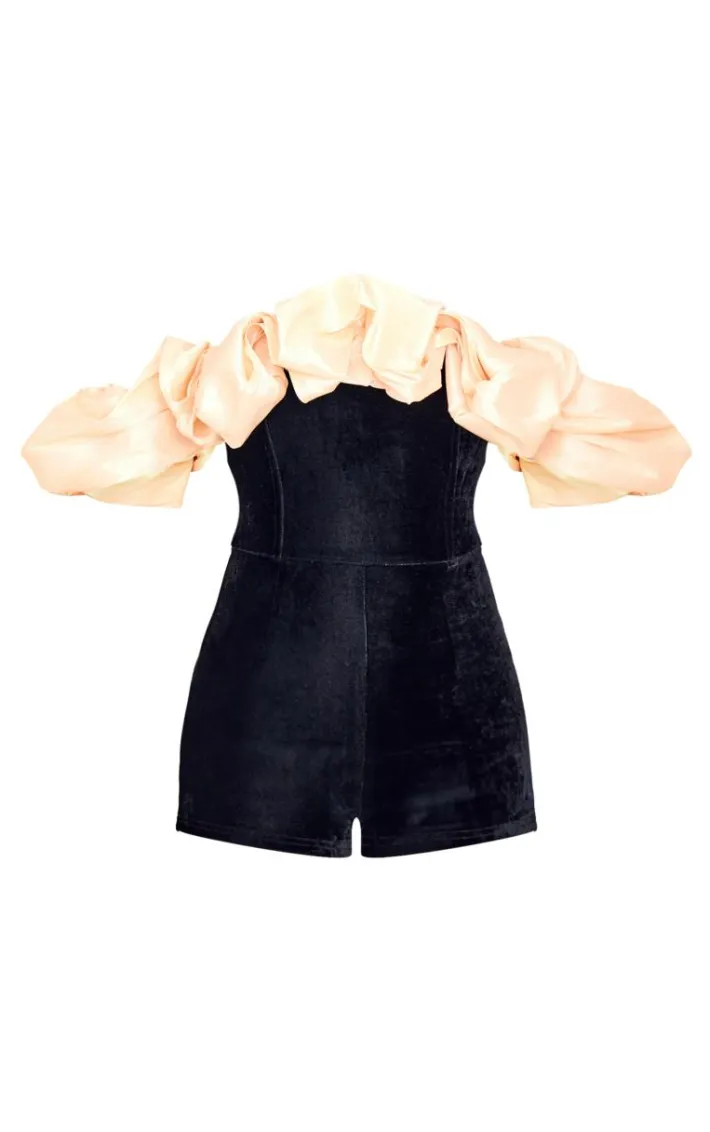 Your ‘what to wear dilemmas’ have been solved with this black contrast bardot puff sleeve velvet romper. Brought to you in a black hue velvet material with a contrast bardot neckline and puff sleeve design, this romper is all the new you need. Team with slip on heels and simple accessories for a look like no other.